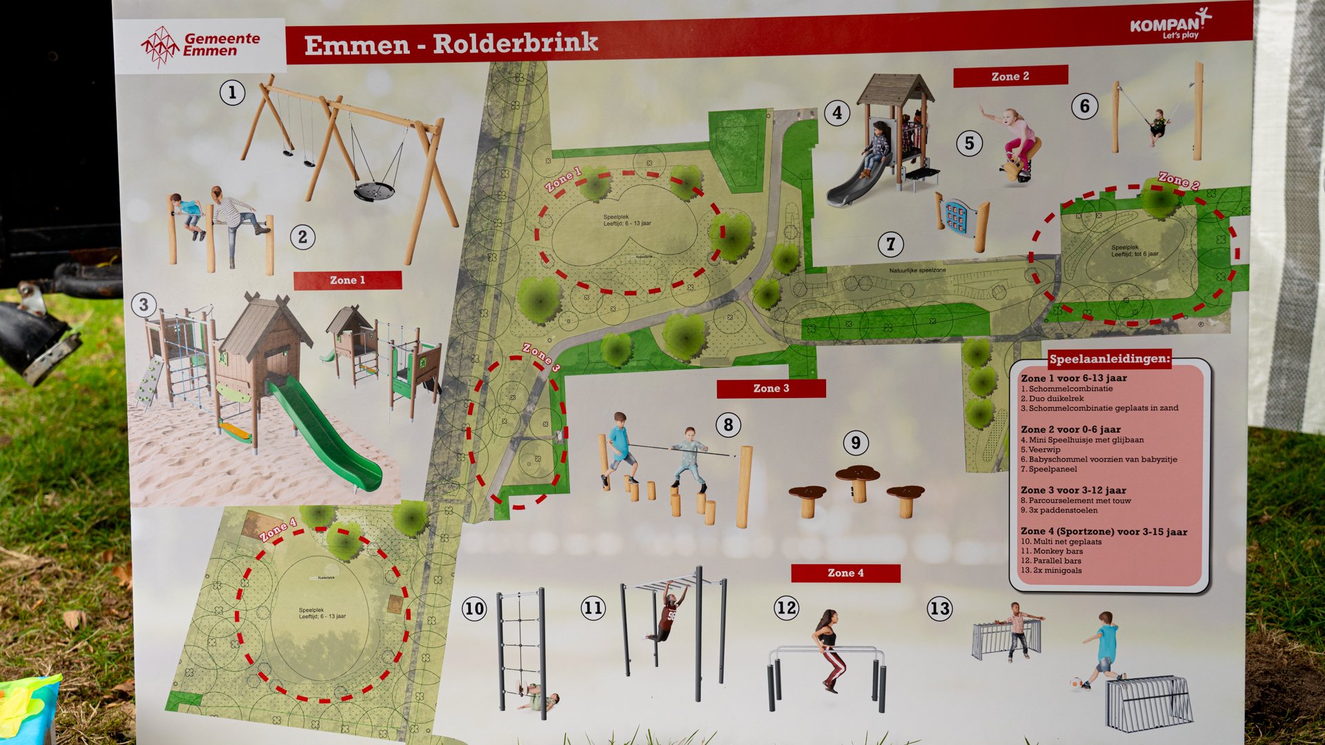 Het speelpark wordt ontworpen voor kinderen van verschillende leeftijden. Het plan is om het park in drie delen te verdelen: een speelzone voor kinderen van 0 tot en met 6 jaar, een zone voor kinderen van 6 tot en met 13 jaar, en een sportveld voor de oudere jeugd.