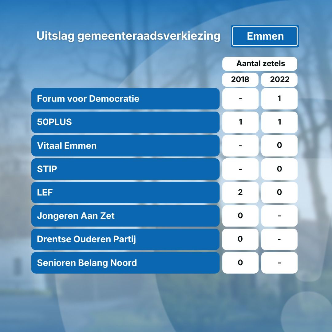 In 2022 deden ook STIP, LEF en Vitaal Emmen mee, maar deze partijen staan dit jaar niet op het stembiljet. Geen van deze partijen behaalde in 2022 een zetel.