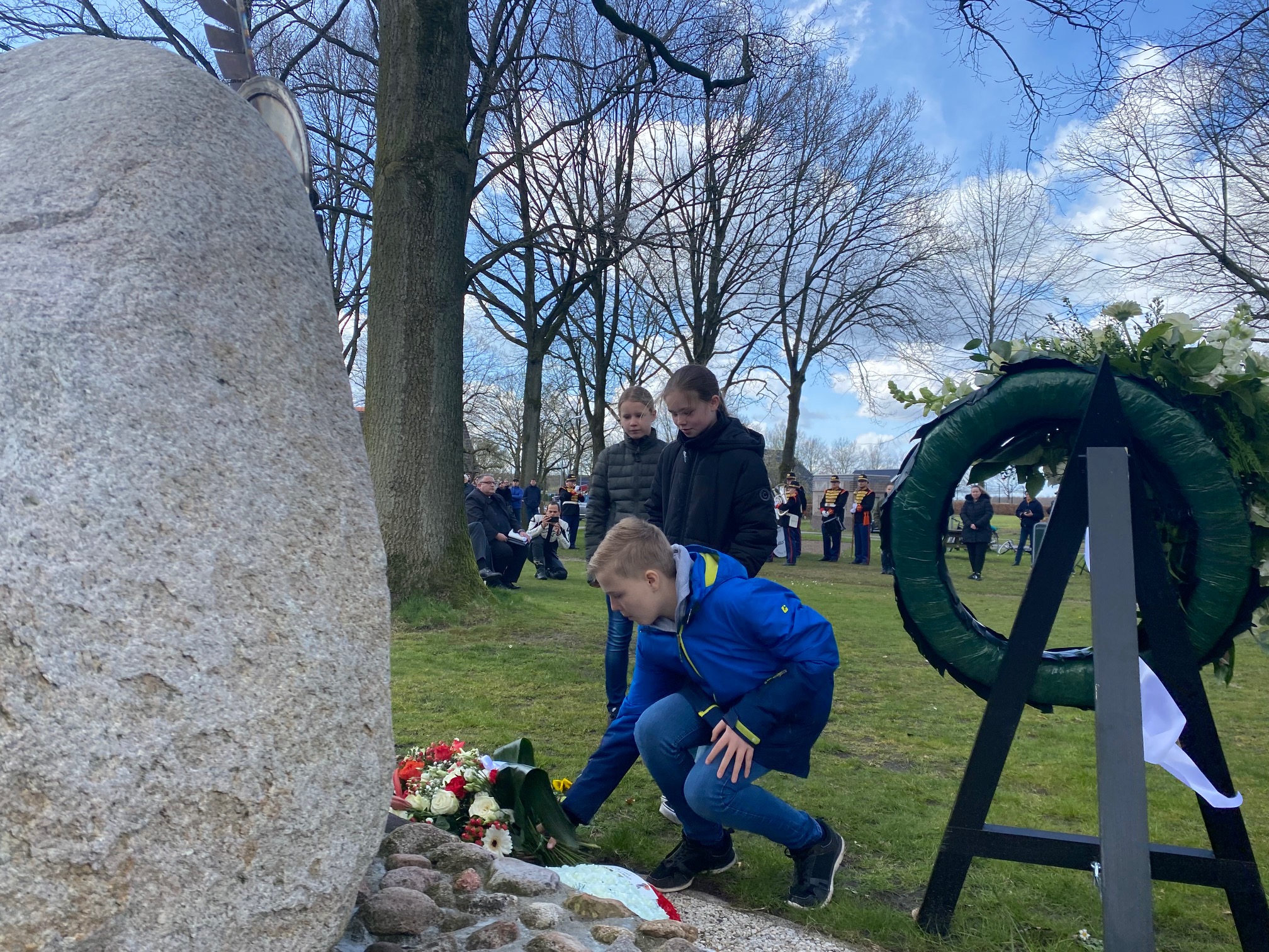 De bloemen en kransen bij het monument, na de herdenkingsceremonie