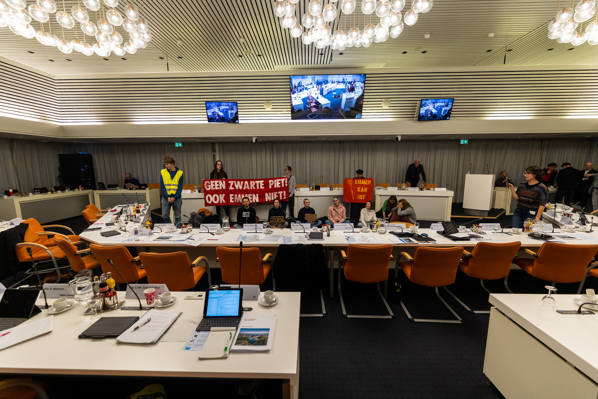 Net na het begin van de vergadering lopen de actievoerders naar het midden van de zaal, waar ze gaan zitten en hun spandoeken en borden met ‘Zwarte Piet is racisme’ tevoorschijn halen. De burgemeester besluit de vergadering meteen te schorsen.