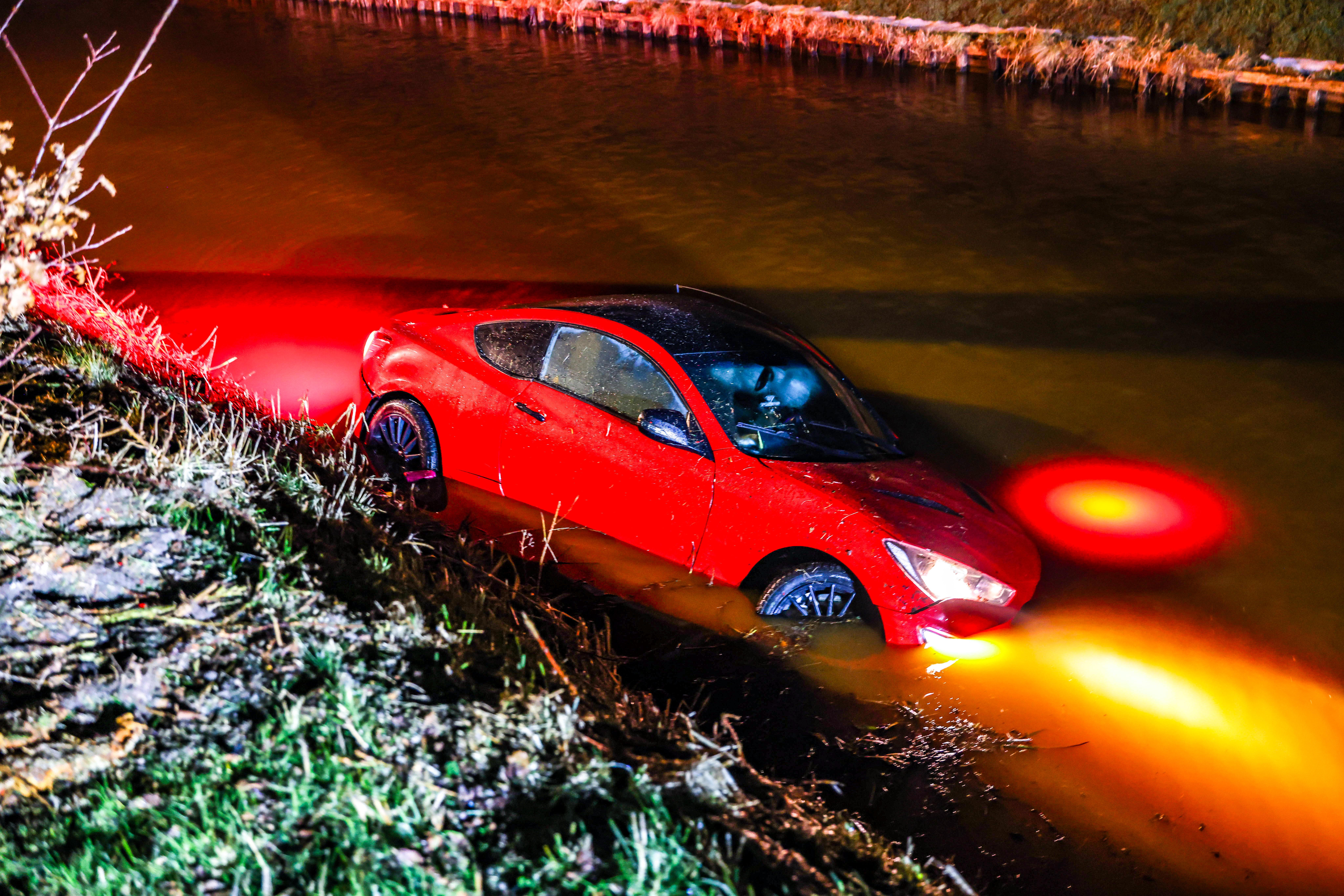 Auto op de kop in greppel door ijzel in Klazienaveen